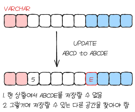 업데이트가 발생하는 문자열의 경우, VARCHAR 이용시 디스크/인덱스 재정렬 비용과 그에 따른 내부 파편화 현상이 발생한다는 것을 유의해야 합니다. 그렇기 때문에 해당 상황에서는 CHAR를 사용하는 것이 유리합니다.
