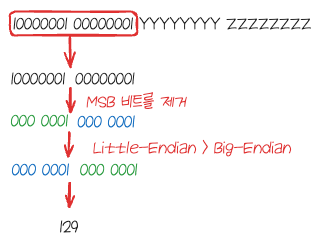 제거한 비트들은 현재 Little-Endian 으로 표기되어 있는데요. 이를 Big-Endian 으로 변환합니다. 그리고 이를 2진수 형태로 해석하면 최종적인 값을 구할 수 있습니다.